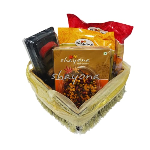 This hamper consists of Shayona Mathiya, Shayona Chorafali, Shayona Dry Fruit Rolls - 5, Shayona Golden Halwa, Shayona Cocktail Mix.